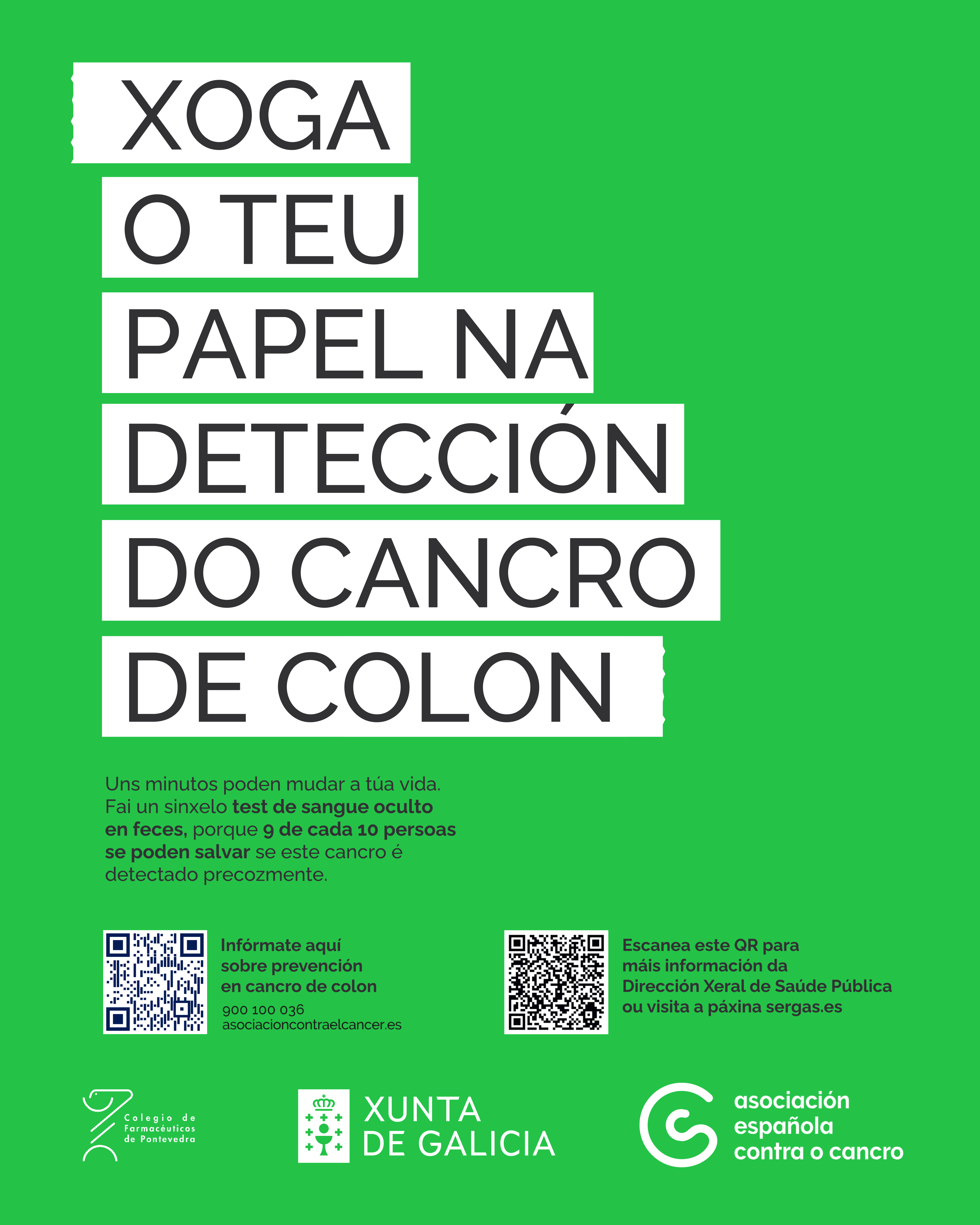 Ultima Actualización: 30 marzo 2026 Colaboración Campaña AECC Cribados Cáncer de Colón Con motivo del Día Mundial Contra el Cáncer de Colon que se conmemora cada 31 de marzo, la Asociación Española contra el Cáncer pone en marcha la campaña “Juega tu papel contra el cáncer de colon”. El objetivo de la campaña es recordar a la ciudadanía la importancia de la detección precoz e invitarles a participar en los programas de cribado. Buscan que la campaña esté presente en diferentes espacios con un mensaje claro: «Unos minutos pueden cambiar tu vida. Hazte un test de sangre oculta en heces, porque 9 de cada 10 personas pueden salvarse si este cáncer se detecta a tiempo», moviendo a la responsabilidad ciudadana en esta detección precoz. Los farmacéuticos colaborarán para multiplicar el mensaje e informarán a los ciudadanos sobre la importancia del cribado.