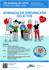 Ultima Actualización: 29 septiembre 2025 Jornada de prevención del ictus Una colaboración con la Asociación Gallega de Enfermería Familiar y Comunitaria (AGEFEC) coincidiendo con el Día Mundial del Ictus, con el objetivo de fomentar la prevención del ictus a través de la promoción de unos hábitos de vida saludable. 29 de septiembre de 2025 |